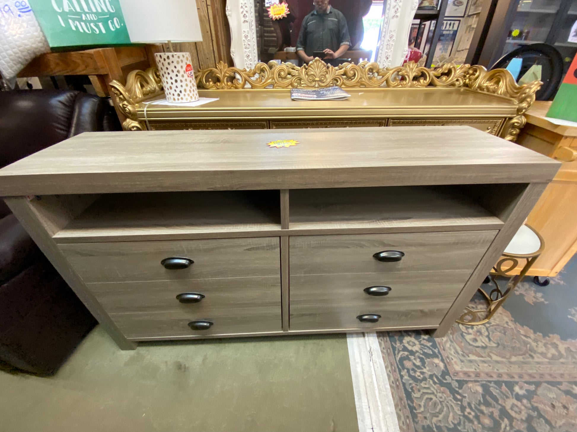 Bring style and organization to your living room with this multi-drawer TV stand from Real Living. Two doors with false drawer fronts and cup-style handles keeps items concealed behind hidden shelving as two spacious open cubbies offer space for media equipment. Finished in a weathered light brown, driftwood-inspired look, this TV stand brings form and function to your entertaining needs.