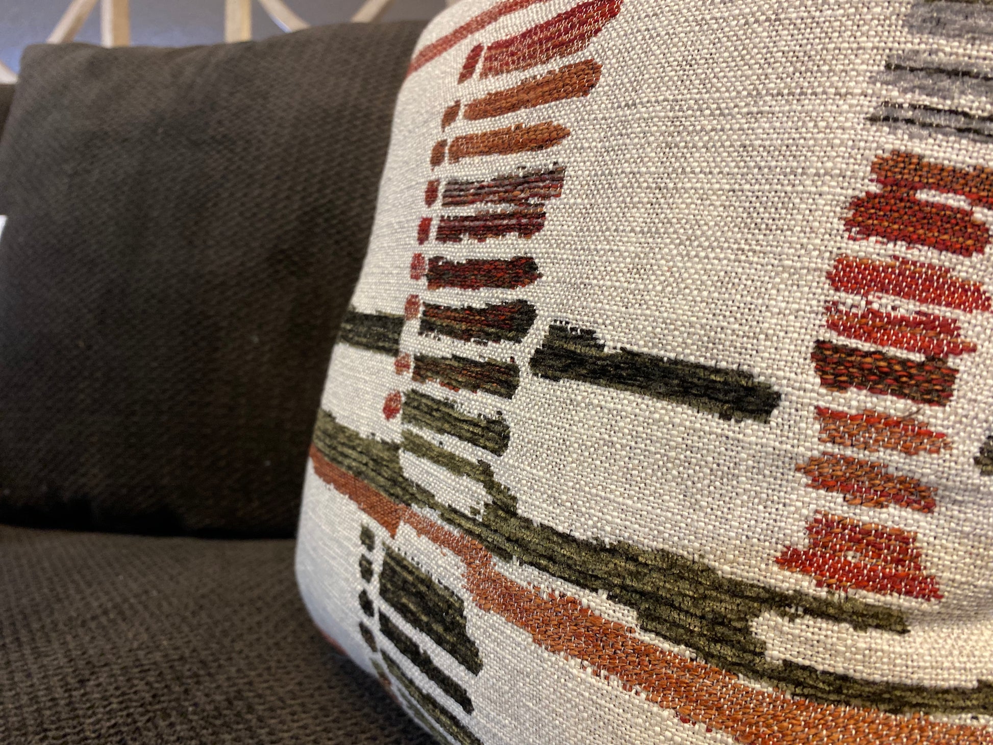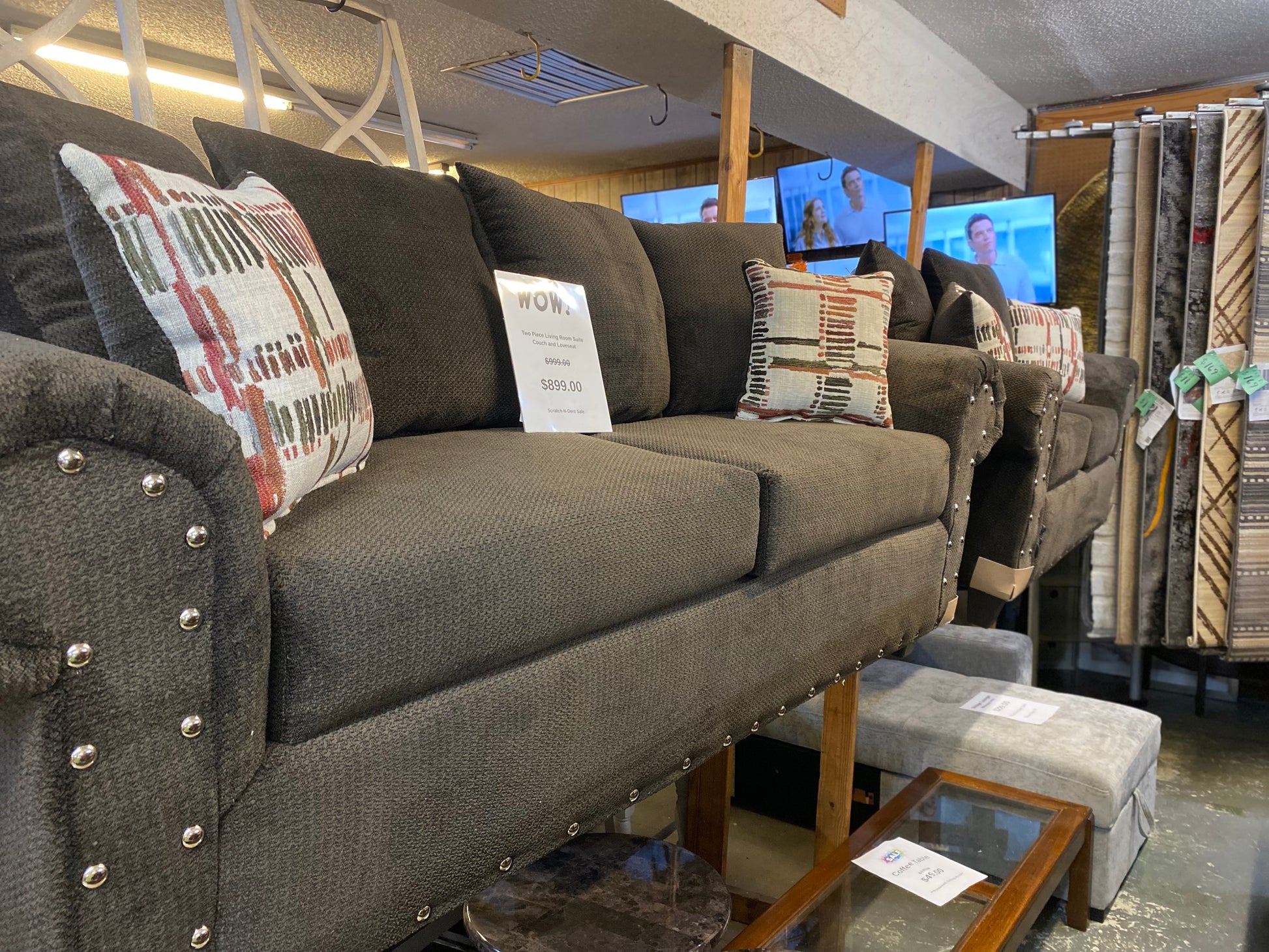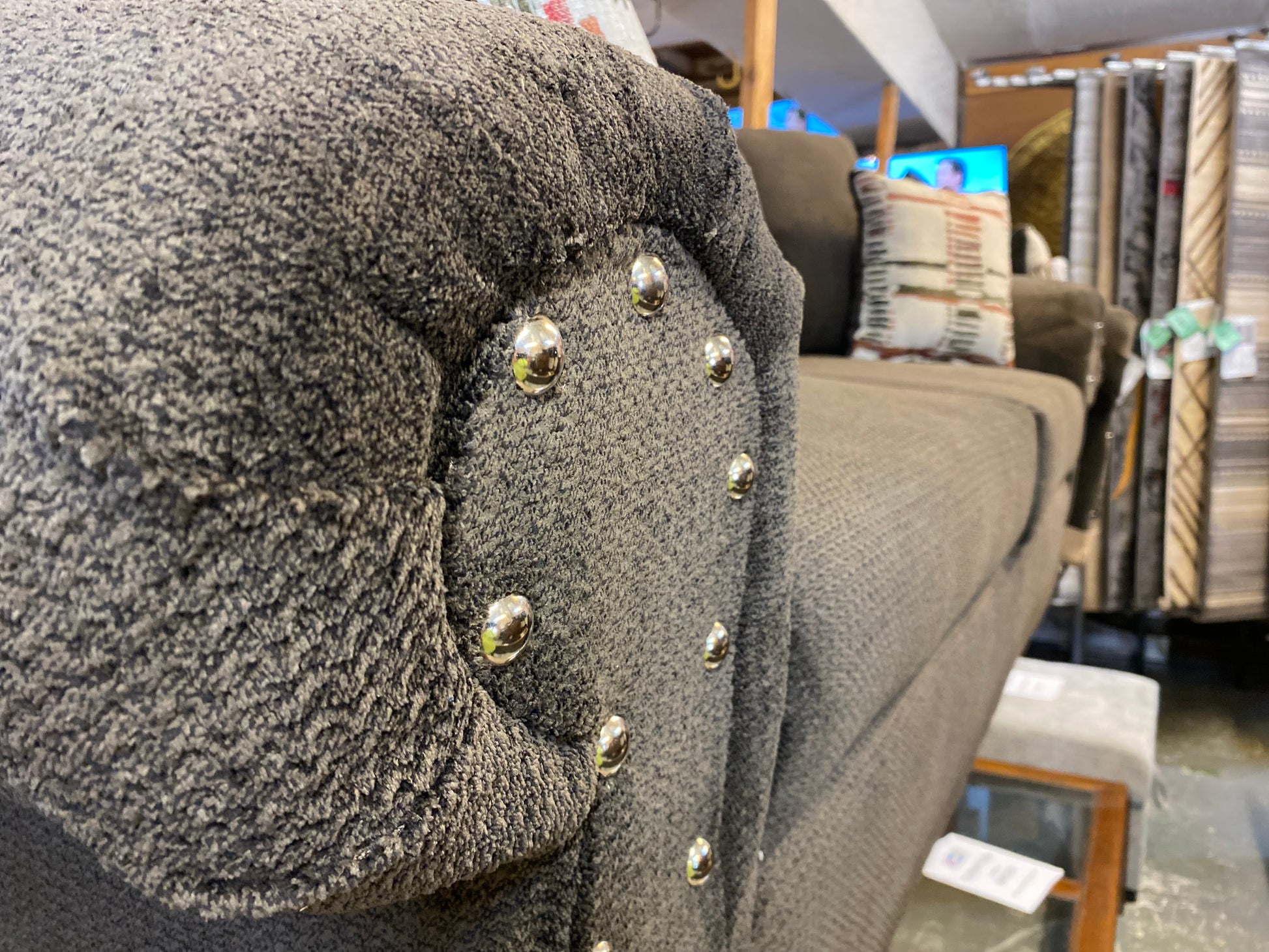 Upgrade your living room with our Brown, Buttoned LivingRoom Suite. This brand new set includes a dark brown couch and loveseat, adorned with silver accent buttons. Enjoy additional comfort with included pillows. Elevate your space with this stylish and sophisticated suite.