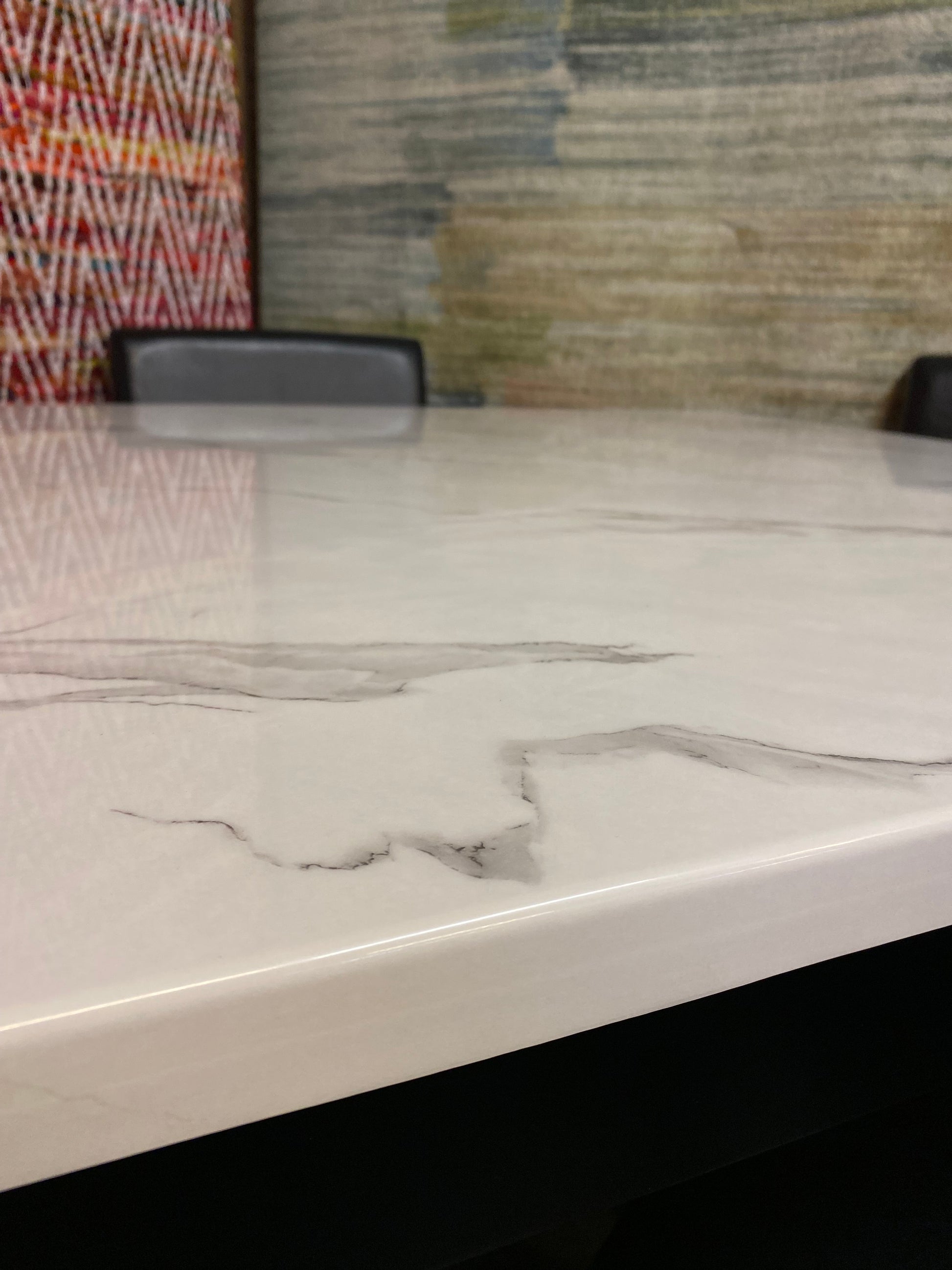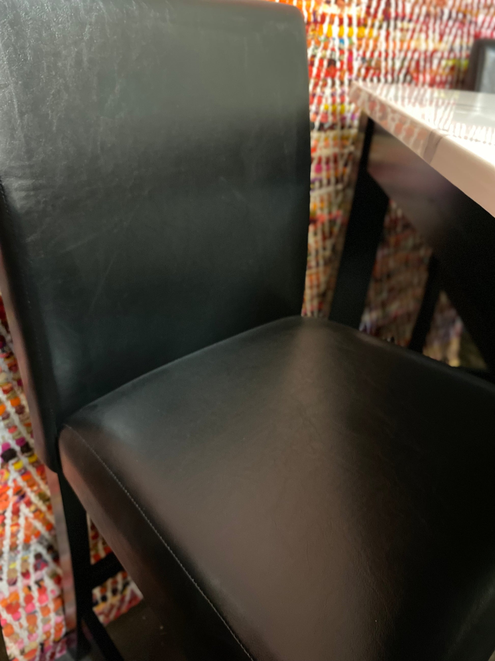 Add some style to your dining room with our Counter-Height Table with Four Barstools! This beautiful set features a white faux marble top with sleek black trim, and the four barstools are upholstered in black leather. Don't miss out on this sale!