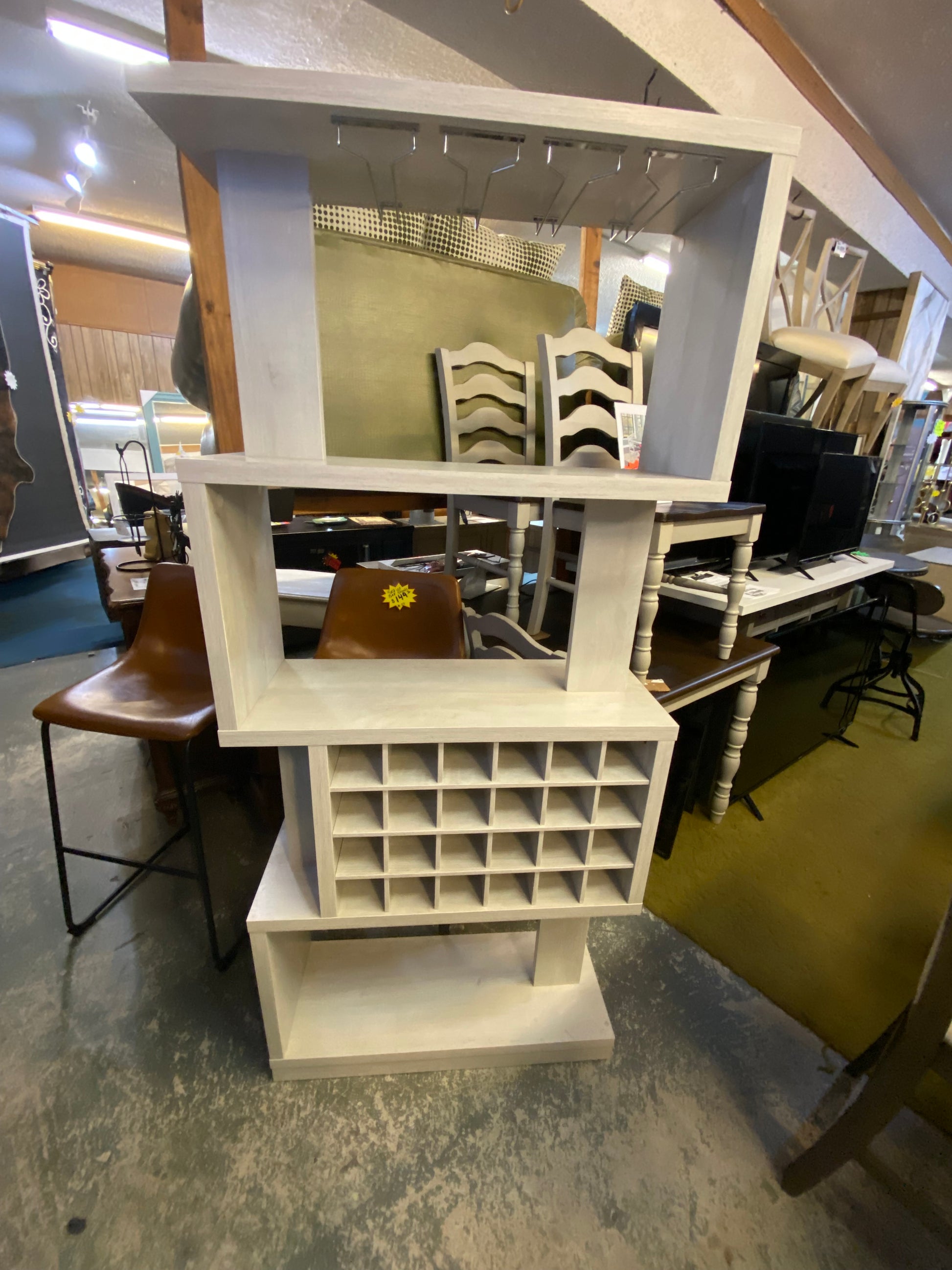 Introducing the Four-Tier Bar Cabinet, the perfect addition to your home bar collection! With 4 tiers, this cabinet offers ample storage space for up to 24 bottles and a glass rack to display your glasses. Organize and display your collection in style with this sleek and functional bar cabinet. Discounted due to it being a pre-owned item; though it is in excellent condition.