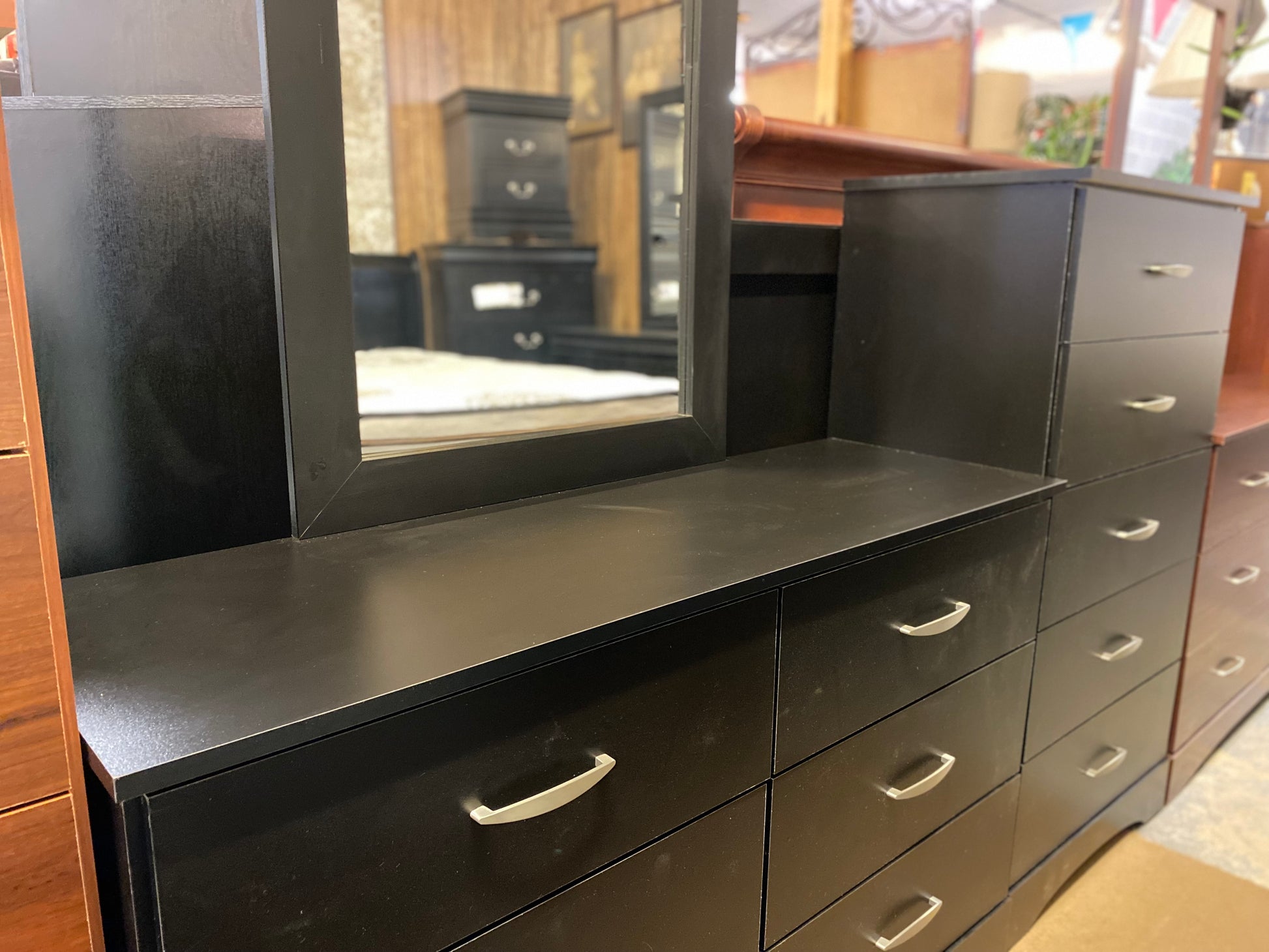 Introducing our "Full or Queen" bedroom suite, complete with a brand new headboard, dresser, mirror, and chest. Instantly upgrade your bedroom with this sleek and stylish set. Choose from full or queen size for the perfect fit. Don't miss out on this must-have suite!