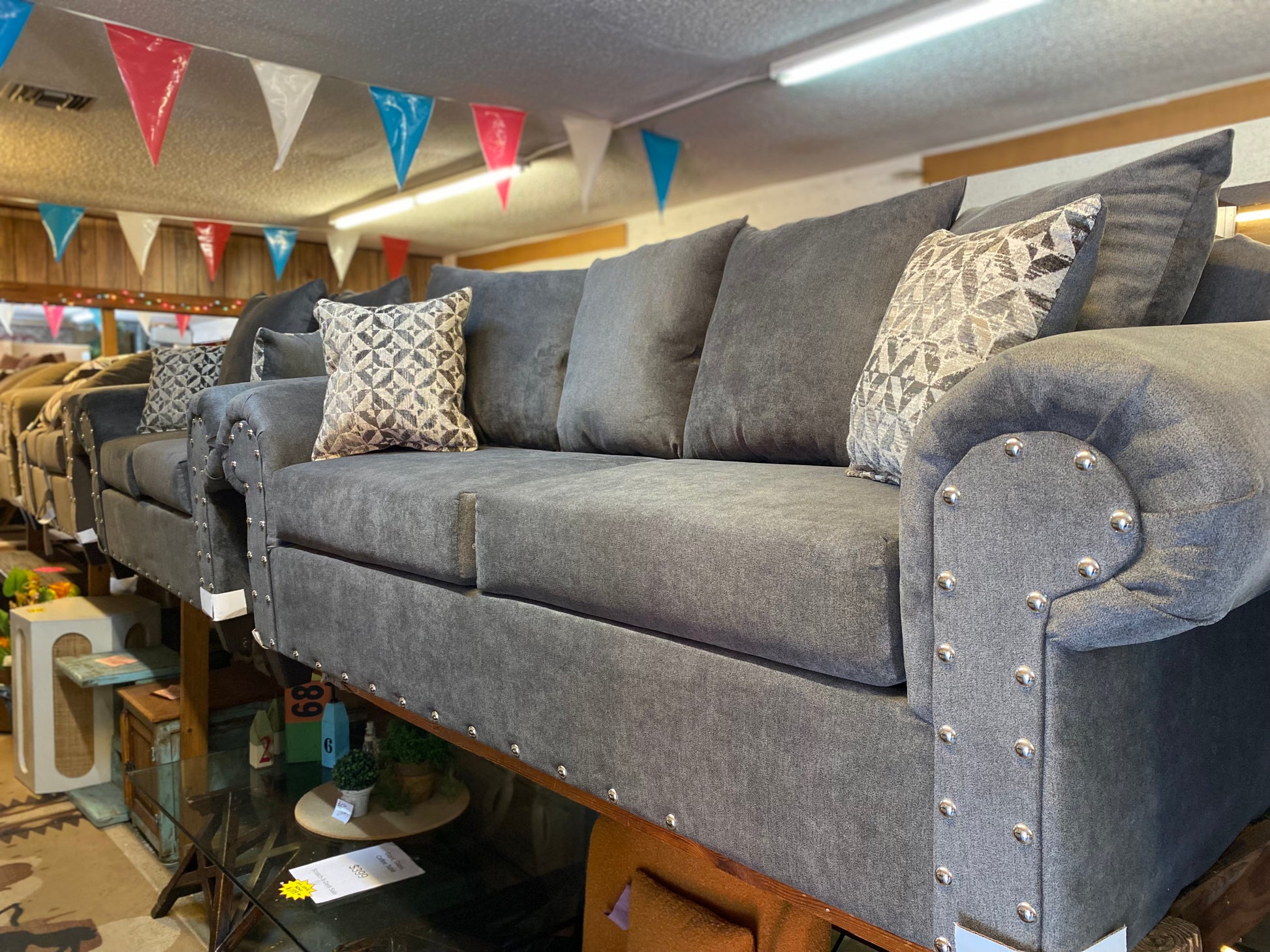 "Upgrade your living room with our sleek and stylish Gray Living Room Suite (MAC 2). This beautiful upholstered couch and loveseat set comes with accent pillows for added comfort. Plus, take advantage of our scratch and dent sale to get it at a discount.
