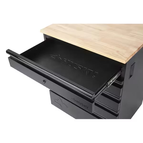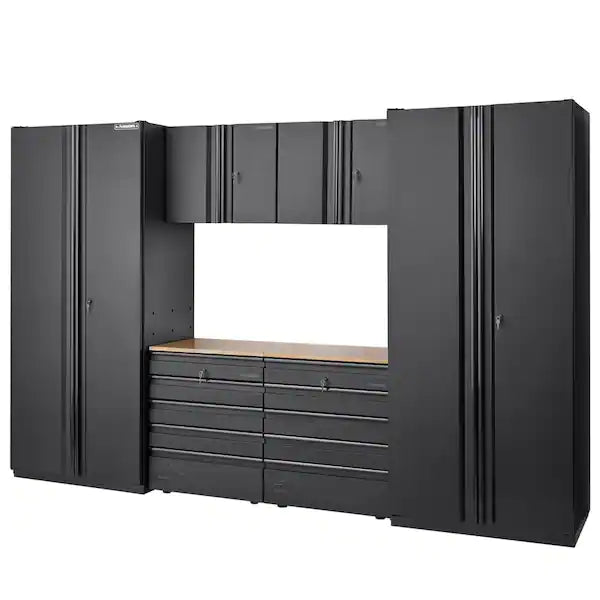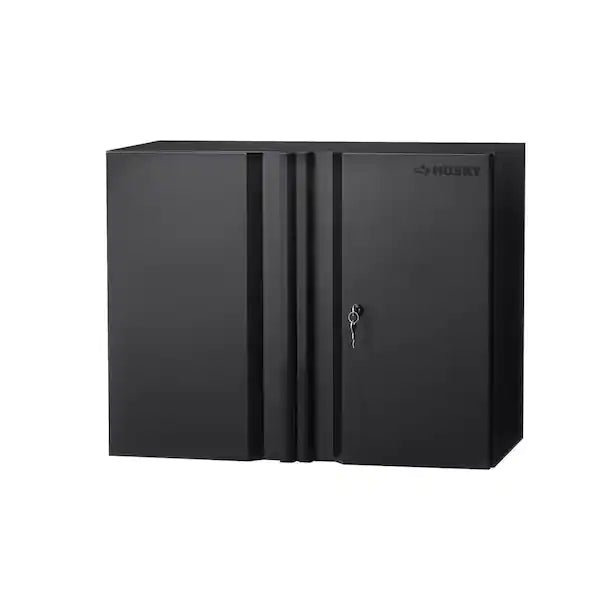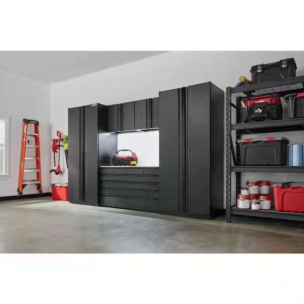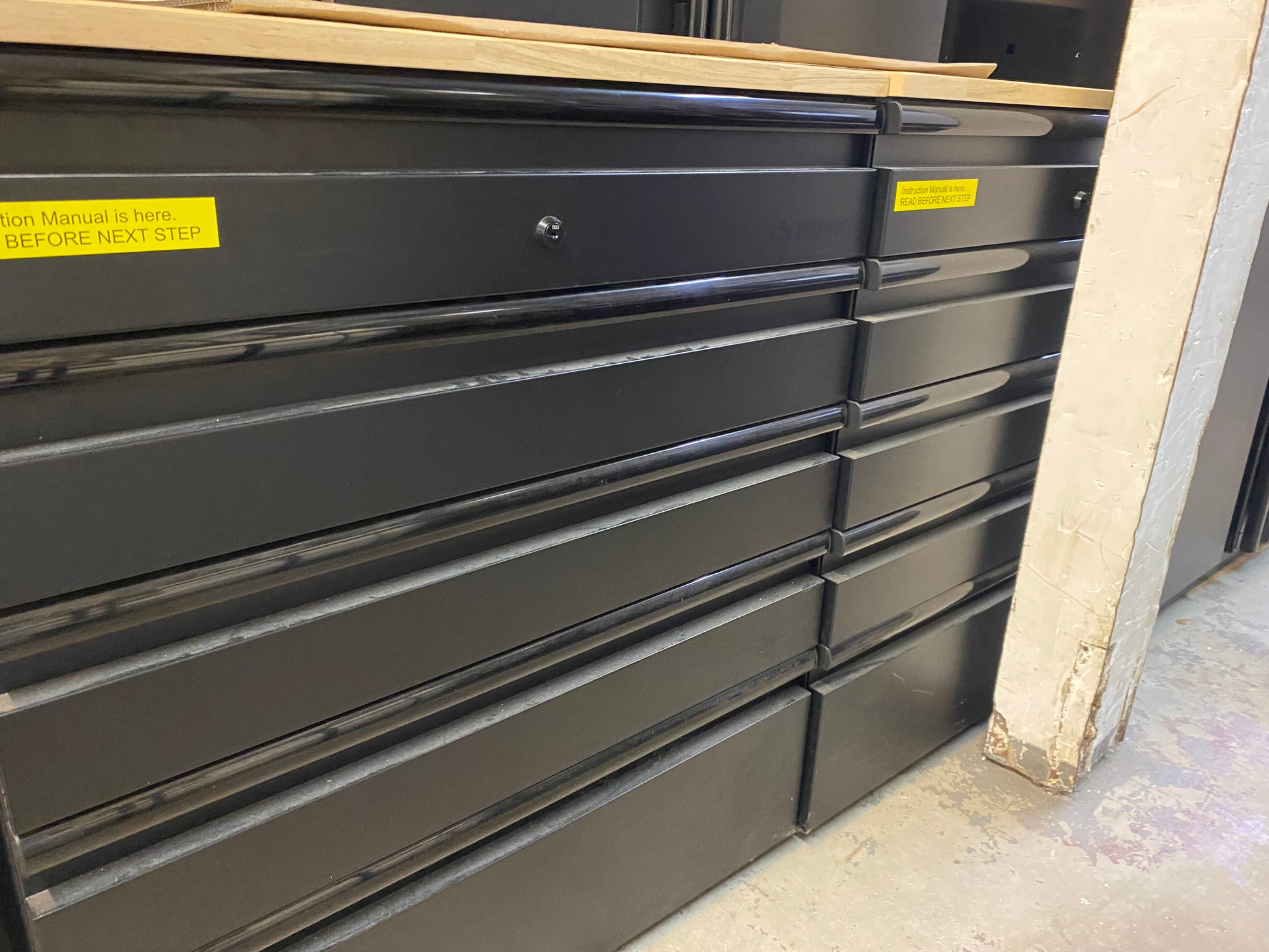 Organize your space with ease using the Huskey Storage System - a heavy duty welded steel solution for your garage in sleek black. The system includes two multi-use lockers, one wall cabinet, and two five-drawer base cabinets to securely store your tools and important items. This item is brand new, but was damaged during shipping, and it is missing an overhead cabinet, which is why we're offering it at a significant discount.