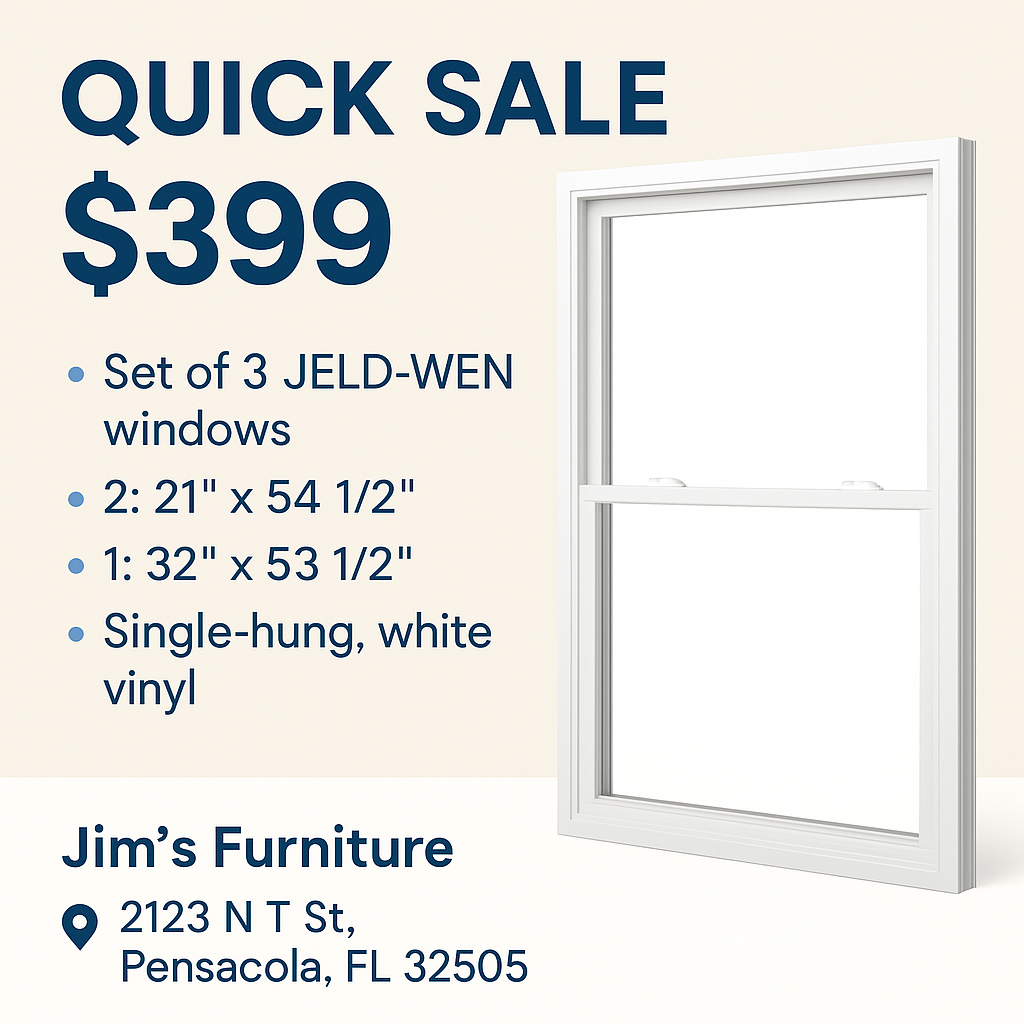 Just in — three brand-new JELD-WEN V-2500 Series single-hung vinyl windows, still factory sealed!