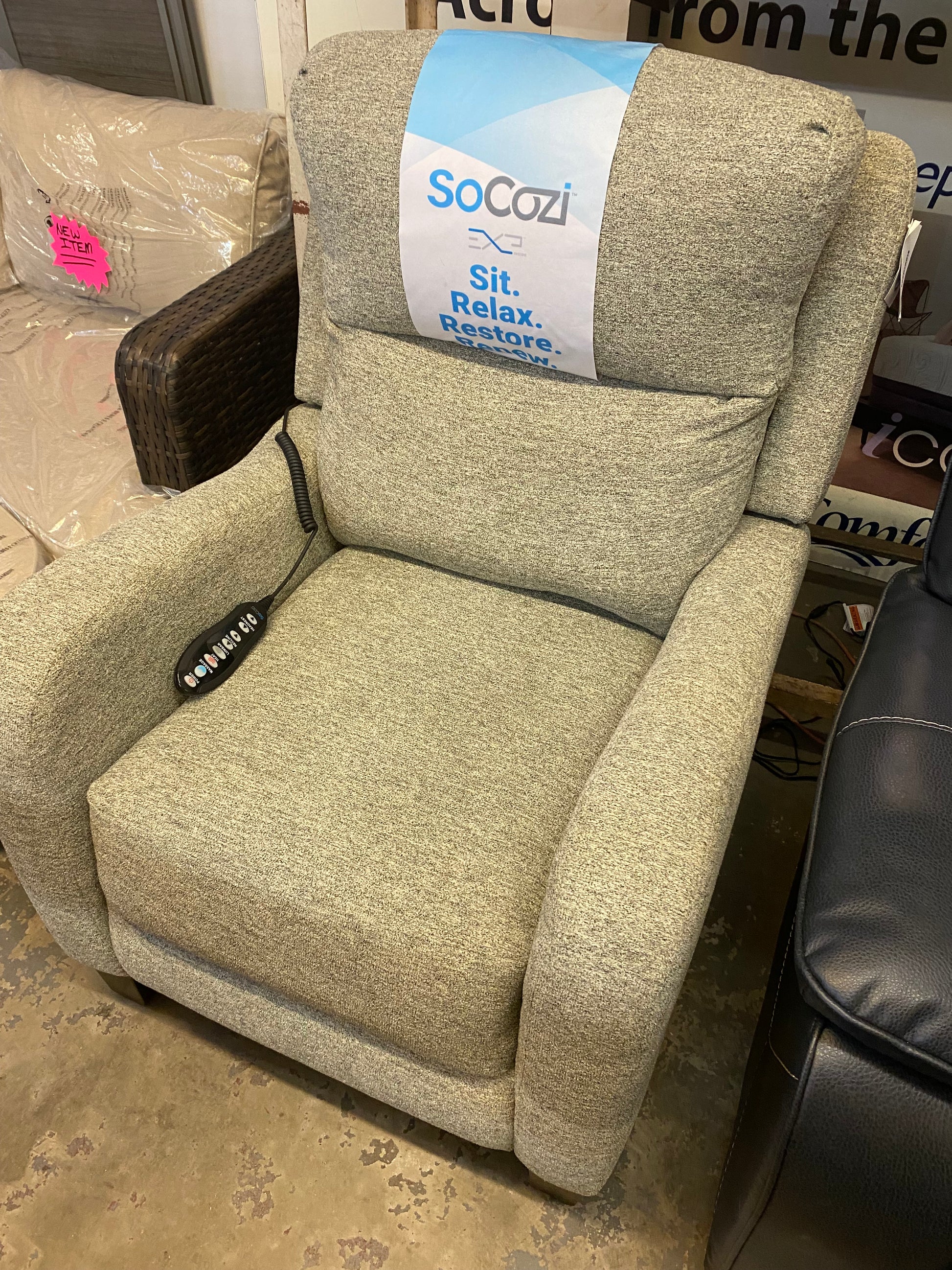 Seeking the look and feel of a traditional chair, but considering something that embodies that elegant touch to enhance your space? With the hi leg recliner, you can transform your living room style from average to formal. Enjoy space saving, extra comfort, and sophistication when you add the hi leg feature to your new favorite chair. Southern Motion keeps high quality construction and extra comfort in mind when it comes to your furniture needs by allowing you to elevate your legs at the desired height of your choosing. While it can be said most of us aspire to own an overly comfortable chair to relax in, few people find it. The Prestige balances all that comfort with amazing style! This recliner uses a transitional frame with an undulating track arm sure to please the most style sensitive person in the house. When the shaping is combined with plump and luxuriously soft back cushions, oodles of relaxing is sure to be had by all. Tapered block feet in a tobacco finish add to the classic tone of this piece. The power headrest feature makes it easy for you to achieve advanced comfort when it comes to your head and neck. Use the power headrest feature to get exactly what you need to ease your head and neck tension, every time you unwind. Our exclusive EXP technology was developed through a partnership with Cozzia, a leader in massage technology. This advanced system utilizes the latest in air cell design, heat therapy, and lumbar support to relax the body and mind. The SoCozi Massage & Heat feature makes it possible to improve health and renew energy while creating a relaxing experience like no other. We are selling this brand new item for a discount due to it being a floor model.